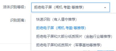 支持用戶自定義活體識別等級,可根據不同使用場景下對安全等級的不同要求,選擇“快速識別”、“拒絕電子屏”、“拒絕電子屏和大部分紙質照片”或者“拒絕電子屏和紙質照片”。