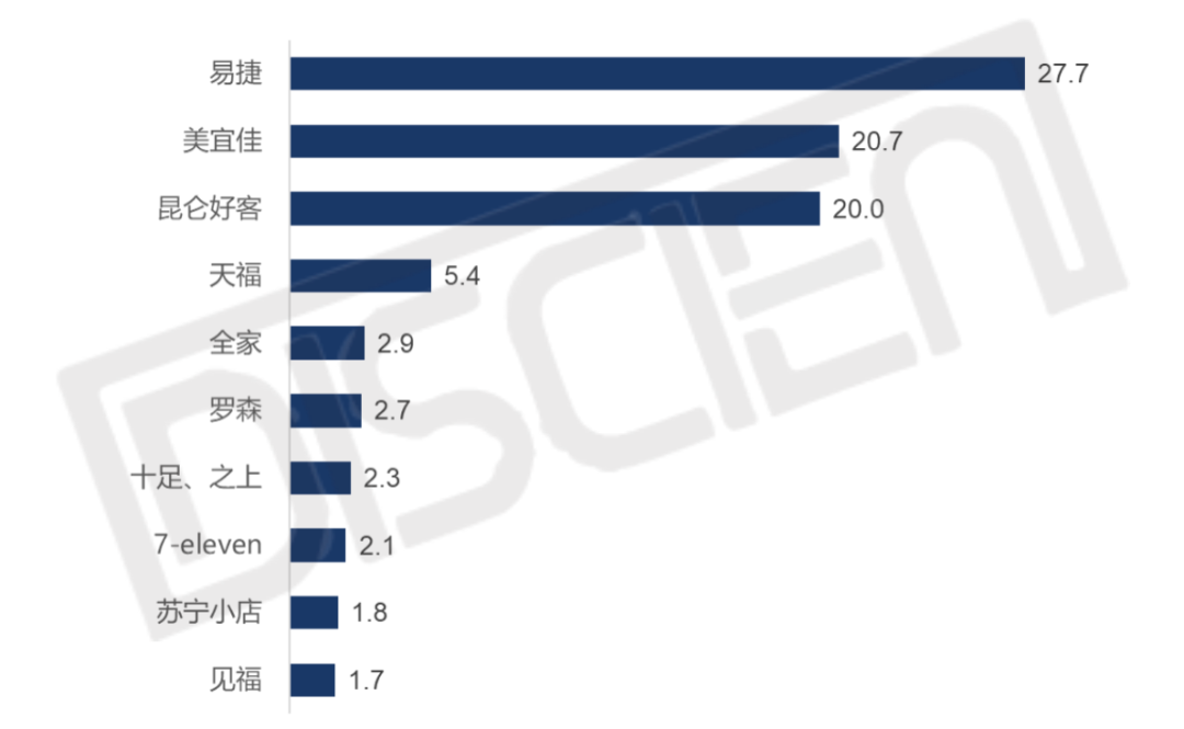 從門店規模看,2020年中國便利店門店規模達14.4萬家,增速為9%,基本維持2019年水平。其中TOP10是易捷、美宜佳、昆侖好客、天府、羅森、全家等。未來便利店數字化改造,商顯產品市場需求或從TOP品牌開始。