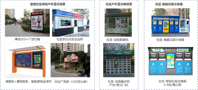 除門禁屏外,智慧社區還有顯示屏應用場景,如:閱報欄、社區廣告屏、社區執行點安全宣傳屏、自助販售機顯示屏應用、智能垃圾分類箱顯示屏應用。