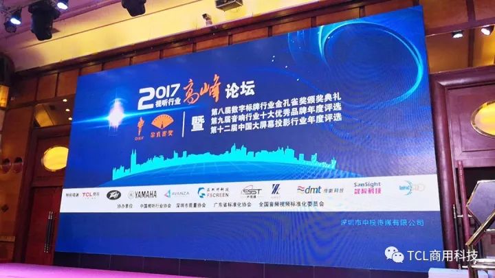 2017年12月8日,2017視聽行業高峰論壇暨第八屆數字標牌行業金孔雀獎頒獎盛典在深圳圣庭苑酒店盛大舉行,本次活動由DS-360數字標牌網主辦,來自全國各地的數百家數字標牌企業相聚一堂,近600人參會,共同見證本年度行業“金孔雀”的誕生。TCL商用作為數字標牌行業有著卓越實力的知名企業,榮獲“2017年度優秀多媒體信息發布系統品牌大獎”。
