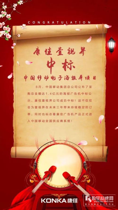 7月20日,中國移動在其招標采購平臺發(fā)布了集中采購電子海報屏的比選公告。一萬六千余臺,約1.5個億的蛋糕,公告一發(fā)出,消息迅速在商顯行業(yè)內(nèi)擴散,各大公司都摩拳擦掌、垂涎欲滴,紛紛積極響應報名。資格審查、樣機測試、投標應答,經(jīng)過一場激烈角逐的競爭和較量,中國移動最終公布結(jié)果——康佳壹視界商顯為本項目的供應商之一!