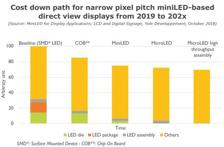 最后,對于大多數目標細分市場,miniLED提供的性能已經接近現有技術,如用于高端消費類顯示器的OLED和用于窄間距數字標牌的SMD LED。因此,成本將成為阻礙或推動miniLED應用的主要因素。
