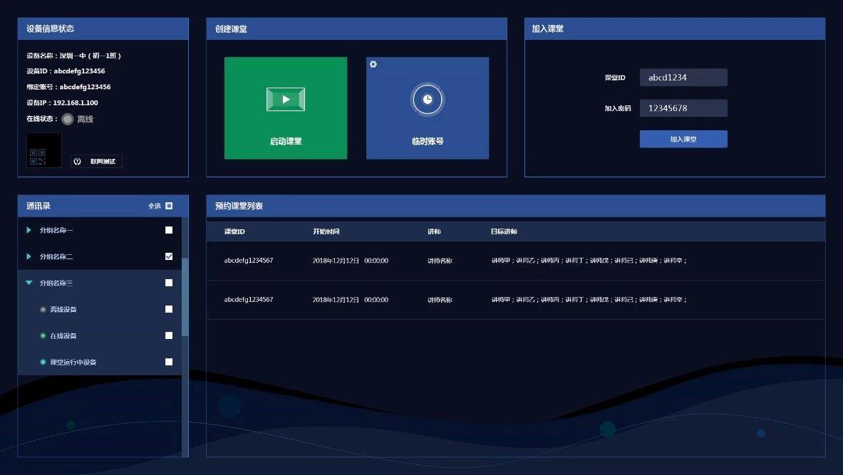 在使用錄播系統的過程中,老師可能會面對多間教室的學生,智微智能針對教師1對N的教學情況設置了通訊錄管理及設備實時狀態獲取,老師可以將學生或者班級按照單位添加到教學通訊錄中,在開課時,直接點擊邀請在線學生或班級,避免手動輸入和查找的麻煩。