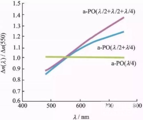 圖3為一般單一光軸材料位相差分布情況,其中APO材料的分布最為理想,而進一步通過1/4λ和1/2λ的A-PO材料的疊加可以得到更接近理想狀態的1/4λ材料---也就是逆波長分布。