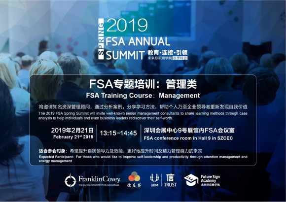 未來標識商學院(Future Sign Academy簡稱: FSA)作為廣告,標識及數字顯示解決方案領域的全球性社群,旨在為社群專業人士提供一個理想的交流和學習平臺。2019 FSA春季峰會專題培訓將邀請知名資深管理顧問,通過分析案例,分享學習方法,幫助個人乃至企業領導者重新發現自我價值。