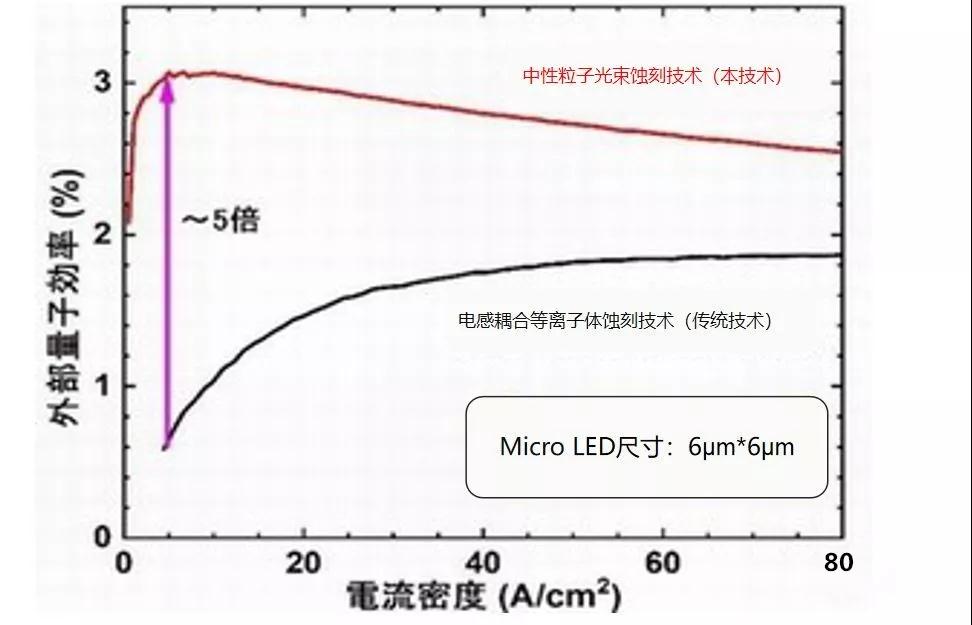 此外,關于6μm的Micro LED,當電流密度為5A/cm2時,比較了采用兩種技術后的發光效率。結果,利用中性粒子光束蝕刻技術試做的產品的發光效率幾乎是ICP蝕刻技術的5倍。