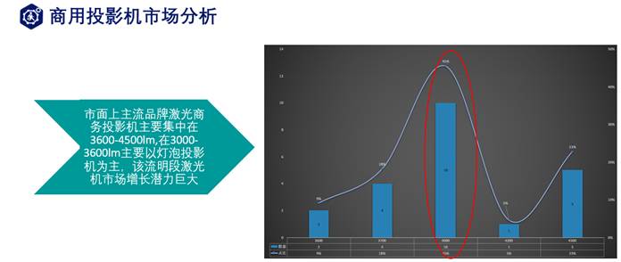 東方中原自有品牌索諾克上市以來,抓住激光新光源的技術革新啟點,掀起投影及顯示技術行業浪潮,翟總提到,市面上主流品牌激光商務投影機主要集中在3600-4500lm,在3000-3600lm主要以燈泡投影機為主,該流明段激光機市場增長潛力巨大