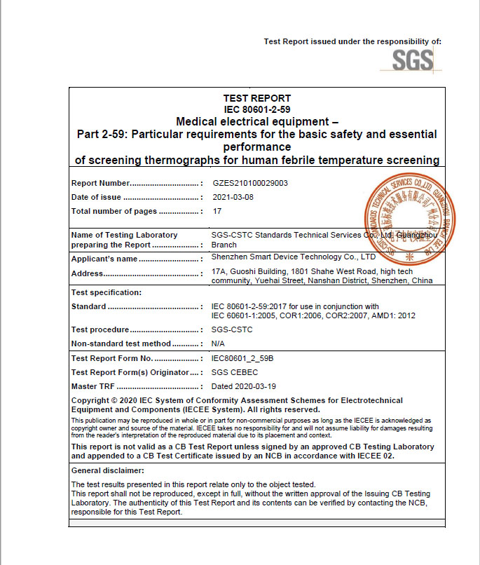 IEC 80601-2-59是關于人類發熱檢查用檢查溫度記錄儀的基本安全性和測溫準確性的具體要求。在醫療設備中,監控人體發熱情況是很重要的一個環節,因此設立的測試標準很嚴格,目的是確保患者的診斷結果。視美泰的AI測溫人臉識別通行管理模組通過80601-2-59的測試時,進行了黑體測溫準確度測試、14天漂移測溫穩定性測試等,均符合相關要求。