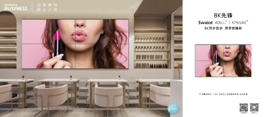 在新零售產(chǎn)業(yè)中,產(chǎn)品展示對畫面的細(xì)節(jié)呈現(xiàn)有著極高的要求。創(chuàng)維商用Swaiot WALL™|KP65A0通過拼接實現(xiàn)物理8K顯示,可以達到7860×4320分辨率,每一幀畫面都擁有超過3300萬像素,能夠讓產(chǎn)品色彩、材質(zhì)極致還原,將產(chǎn)品質(zhì)感和設(shè)計美感淋漓盡致地展示在消費者眼前。