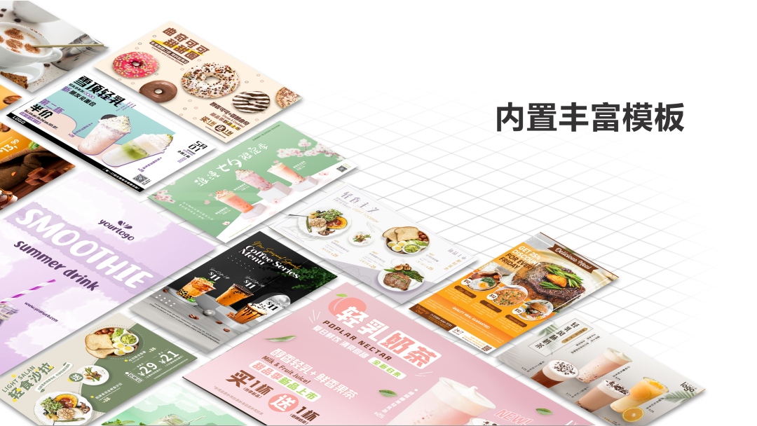 除此之外,更有菜單模板隨意選,千店千面一鍵發(fā),省時省力,再也不用提前十天半載就開始準備排版打印和設計,更加節(jié)省物力財力~靈活的畫面加上個性的設計,讓門店陳列更生動、更有趣,拉新引流不在話下。
